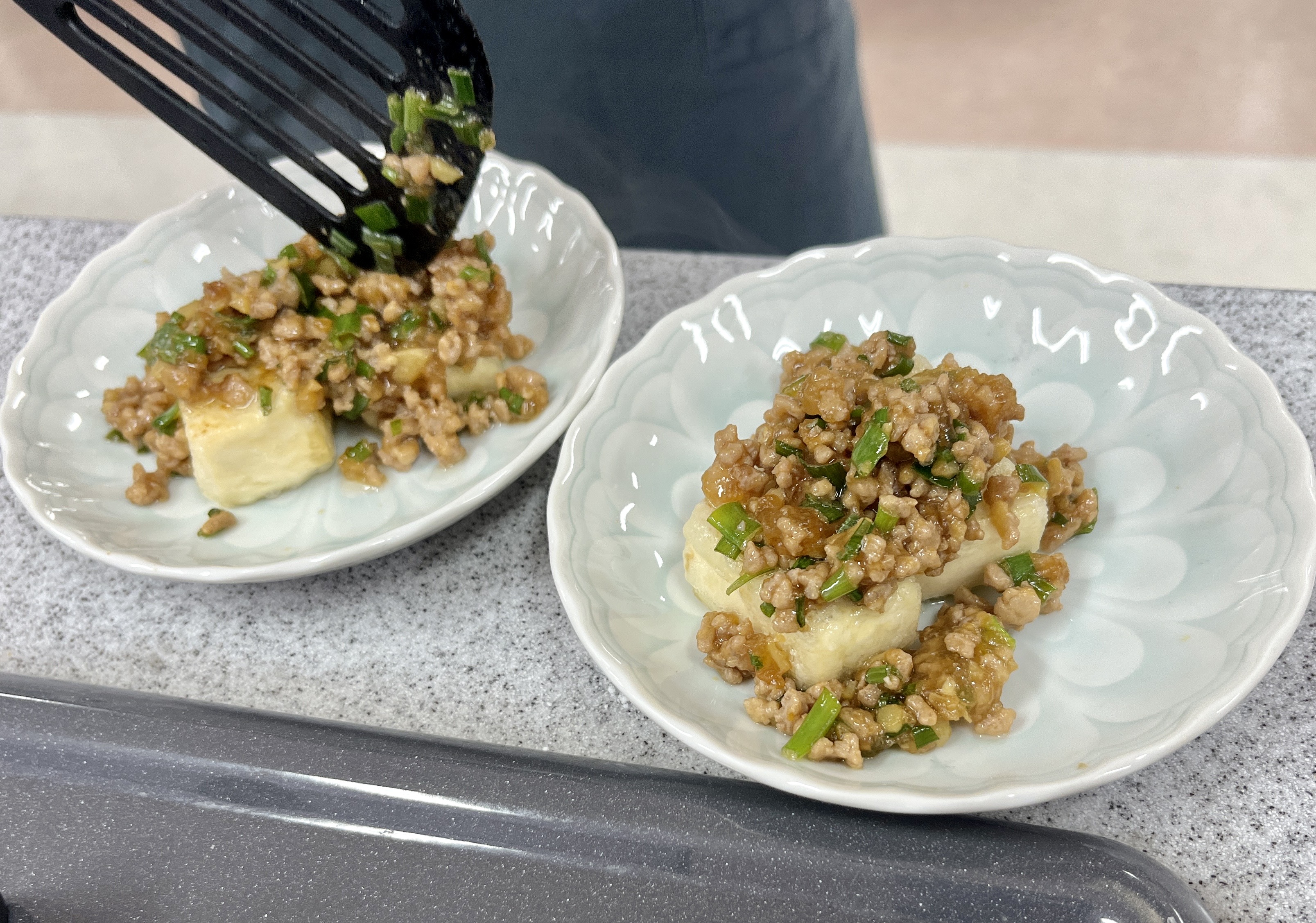 肉みそたっぷりの揚げ出し豆腐。油や調理の手間を減らすため、