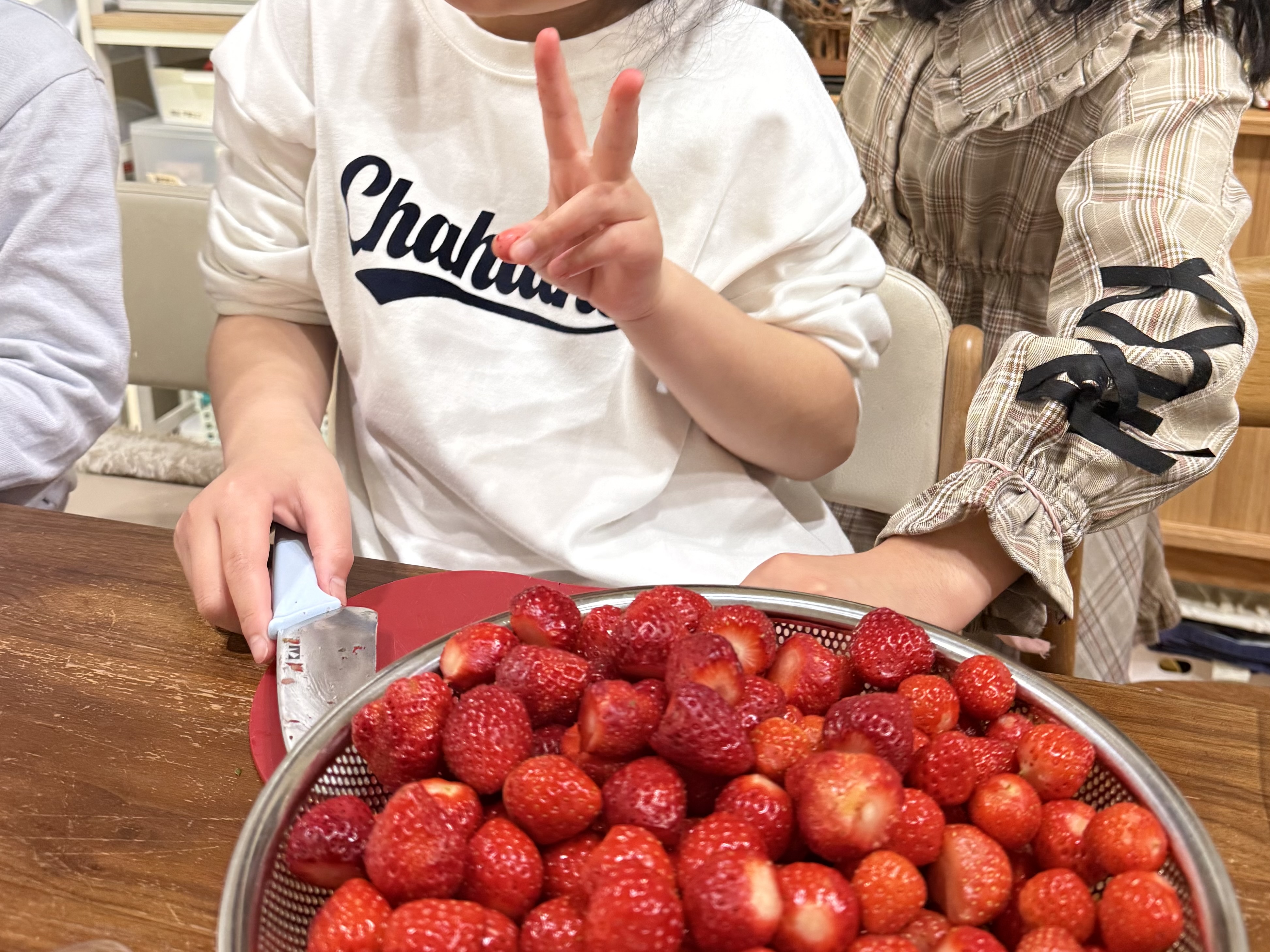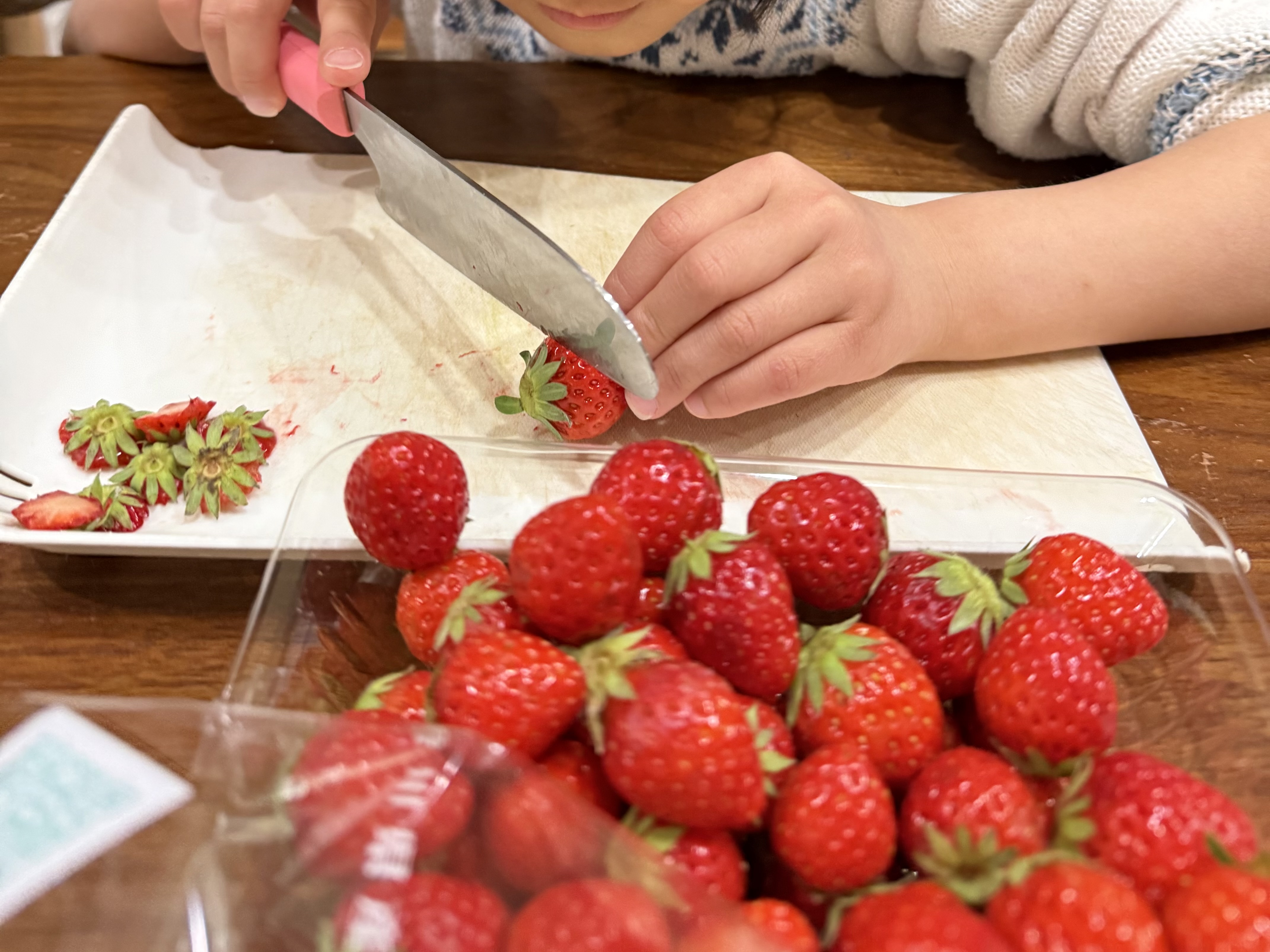 まずはヘタ取り。貝印のこども包丁(初級用)を使って、いちごのヘタを切ってもらいました。