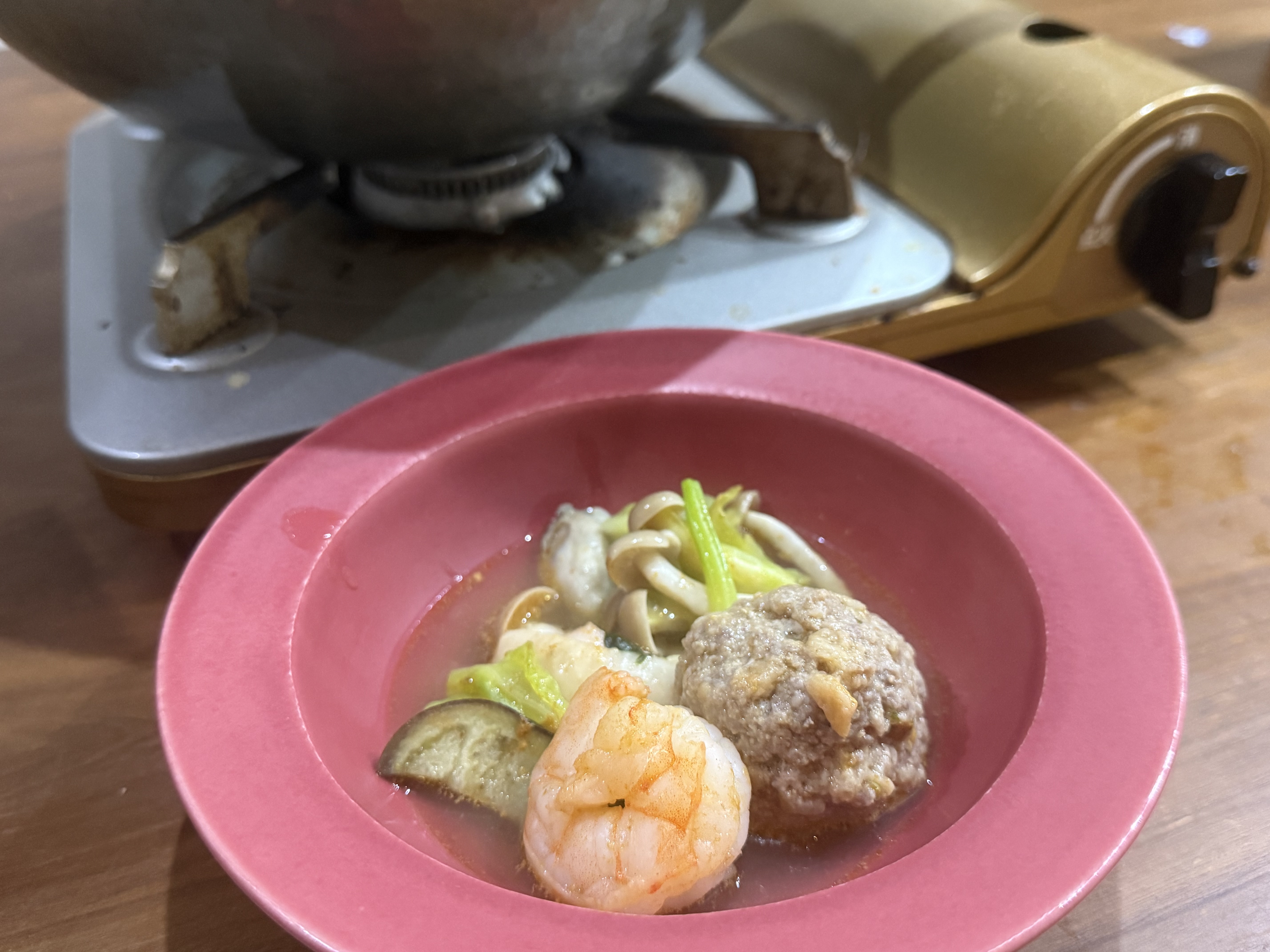 具材は贅沢に野菜、海老、ホタテ、牡蠣、ミートボール、しめじです。