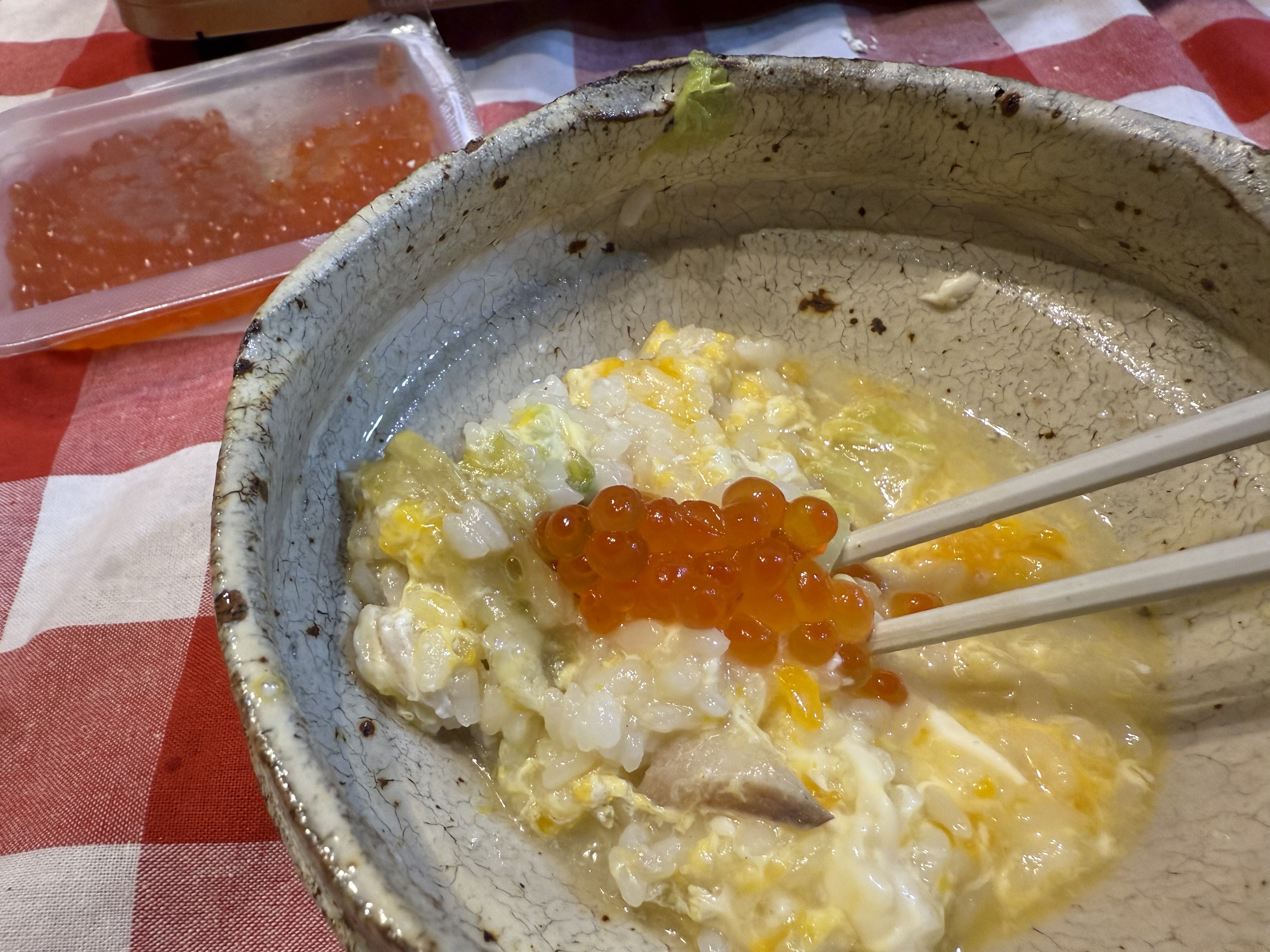 ホタテの旨みが煮詰まったこのスープにご飯と卵を投入して…そしてイクラをトッピング!