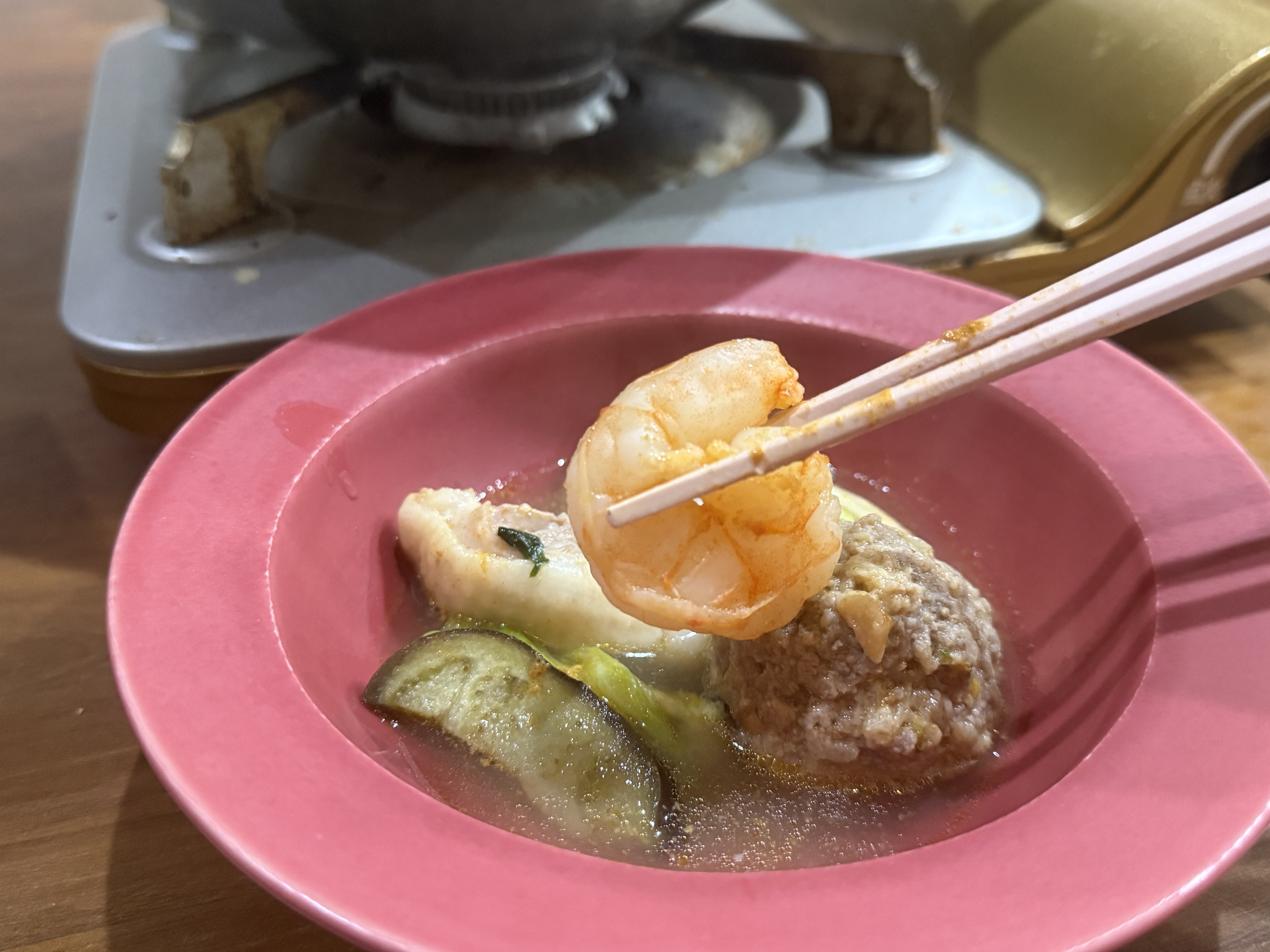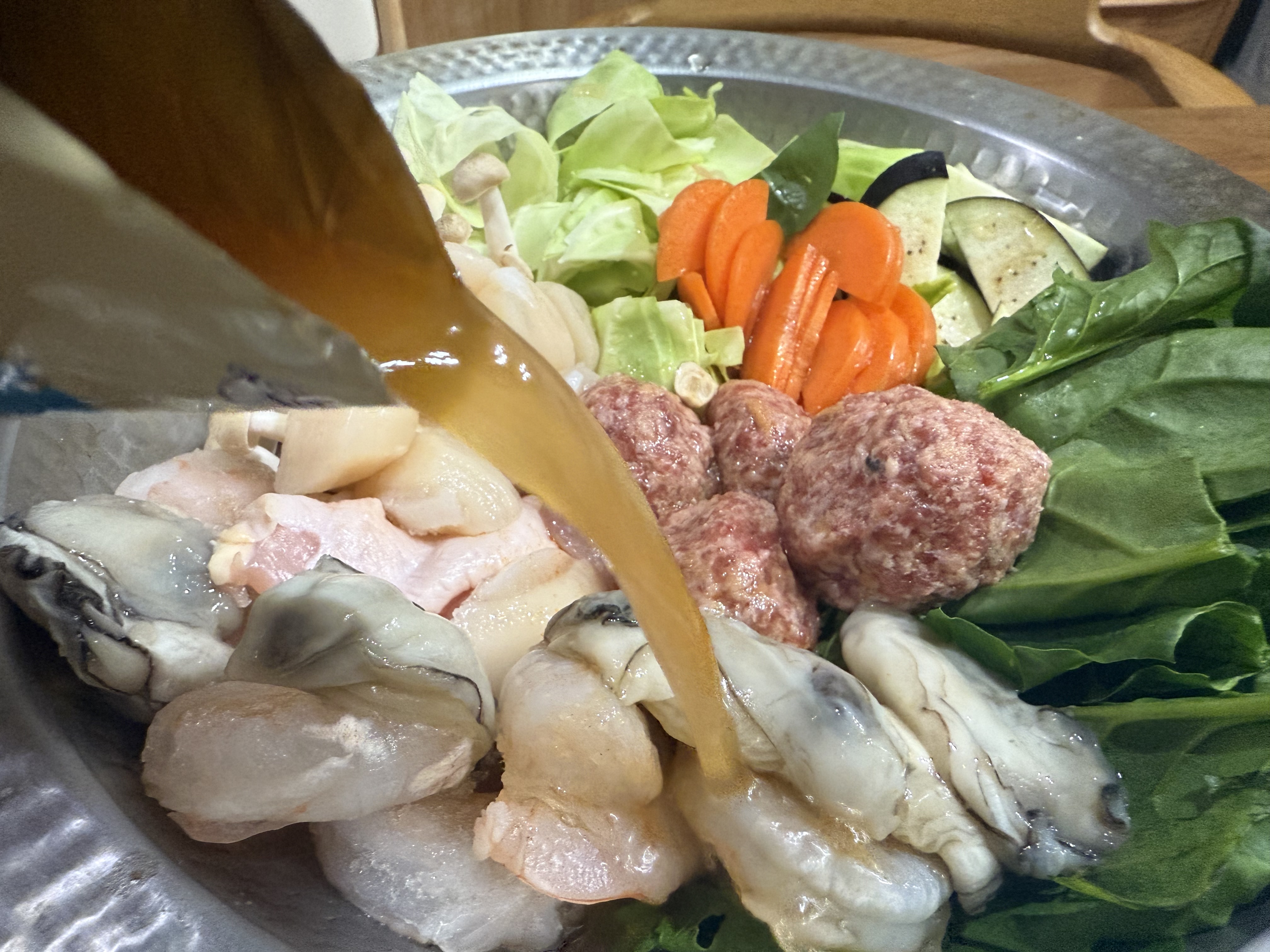 具材は贅沢に野菜、海老、ホタテ、牡蠣、ミートボール、しめじです。