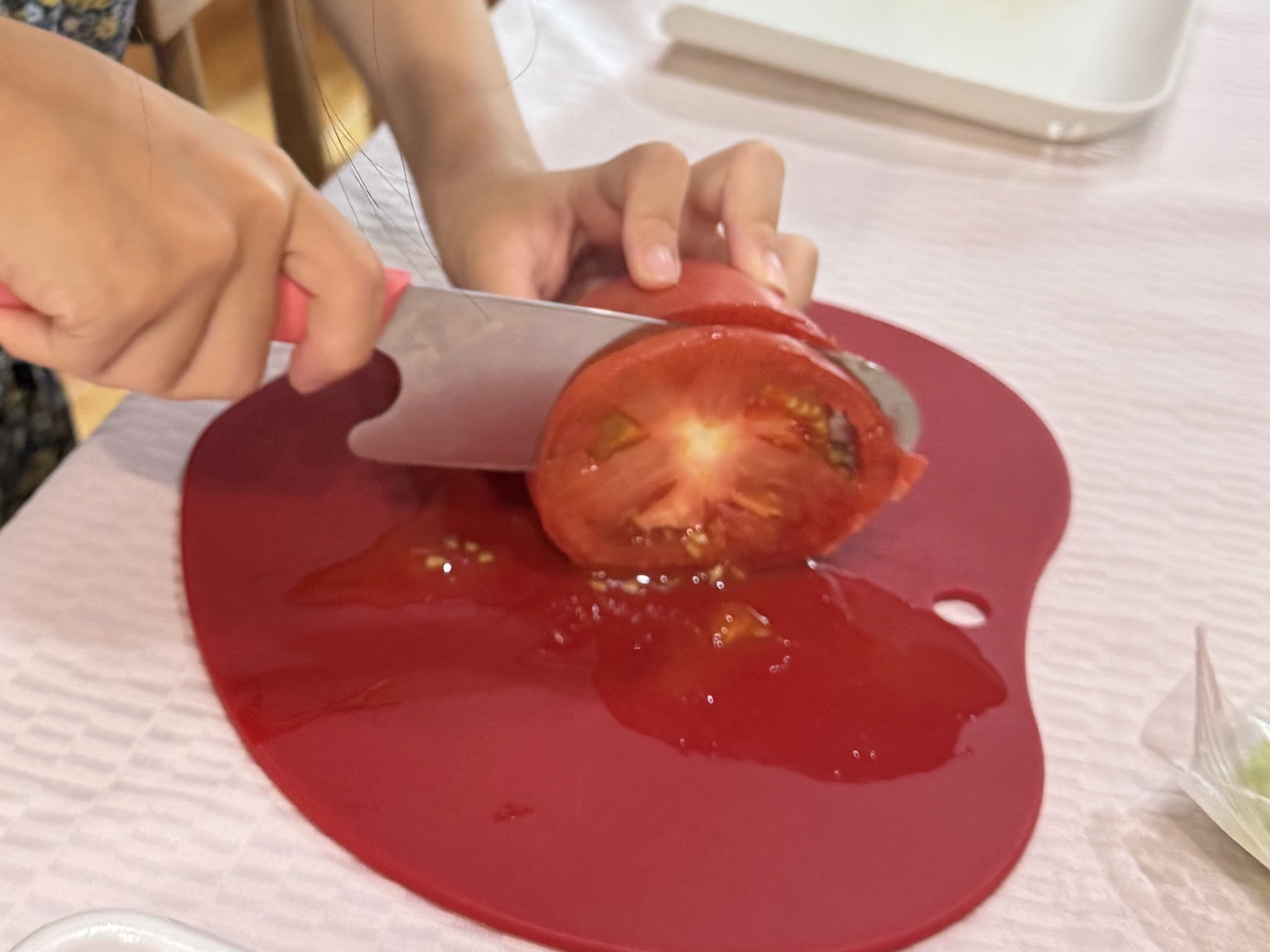 トマトは薄切りにチャレンジしてもらいました。