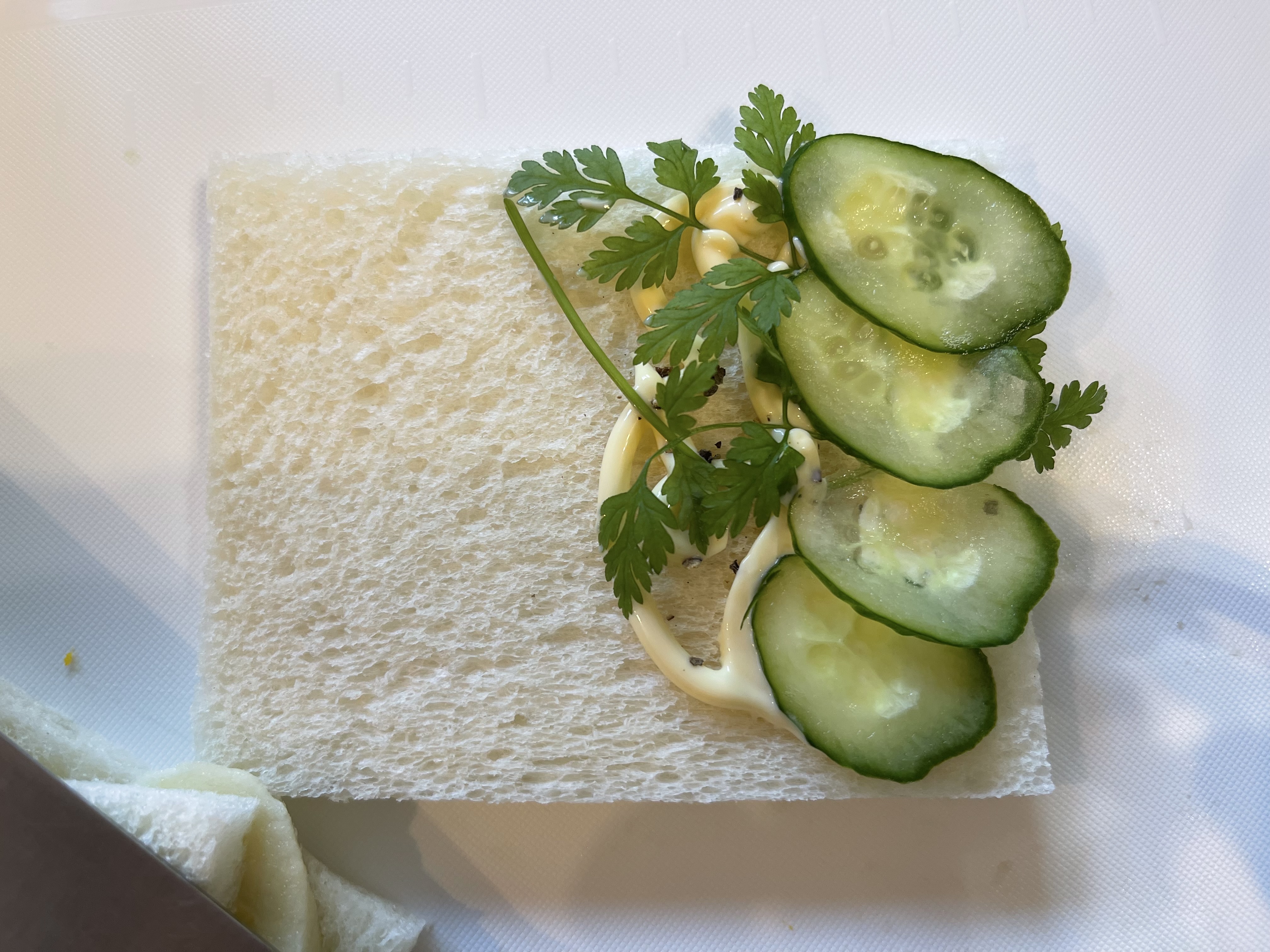 マヨネーズ、ブラックペッパー、きゅうり、チャービルを挟んだサラダサンドや