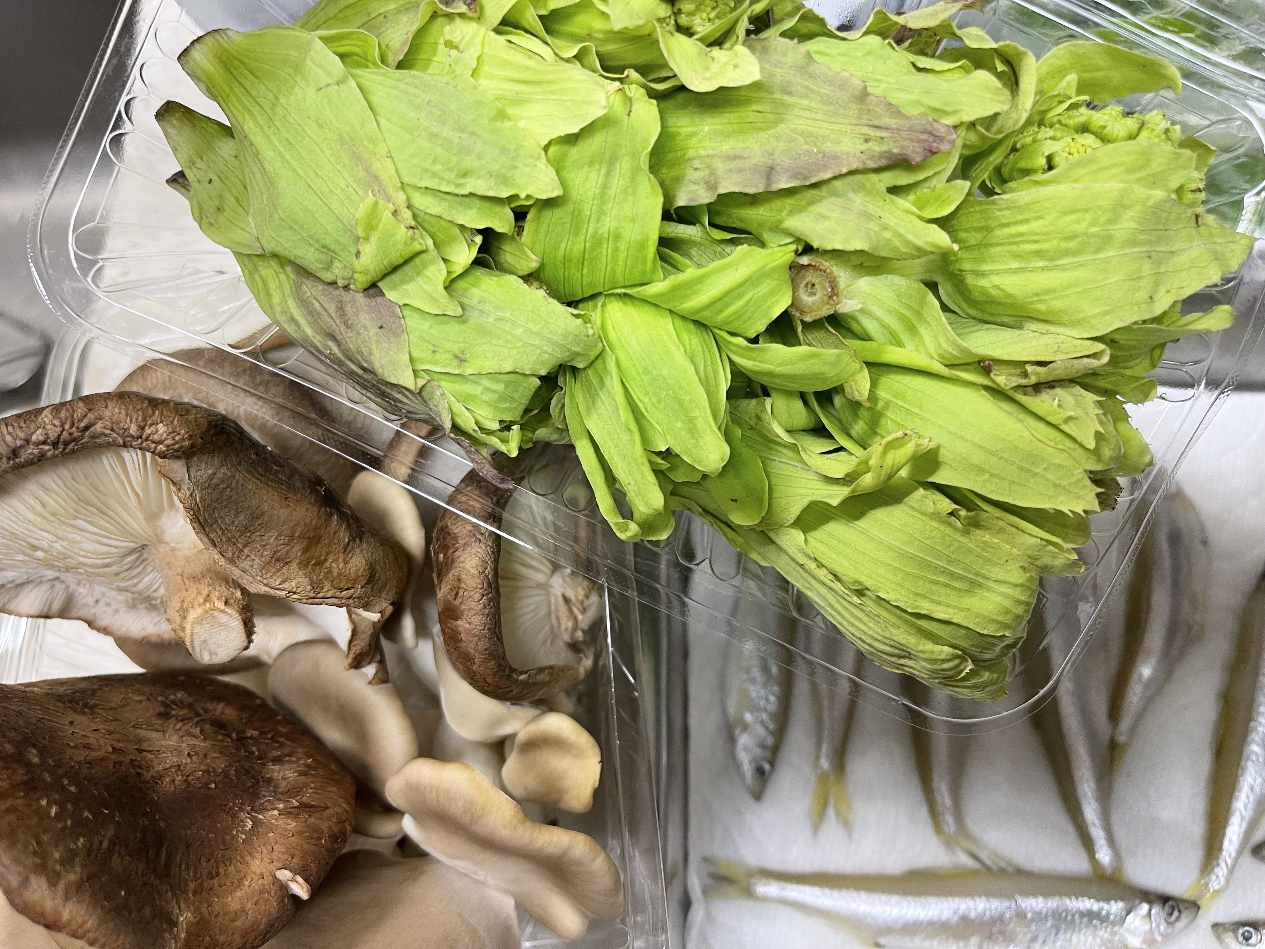 きのこ、セリ、ふきのとう、お豆腐、お米、お酒などを購入しました。